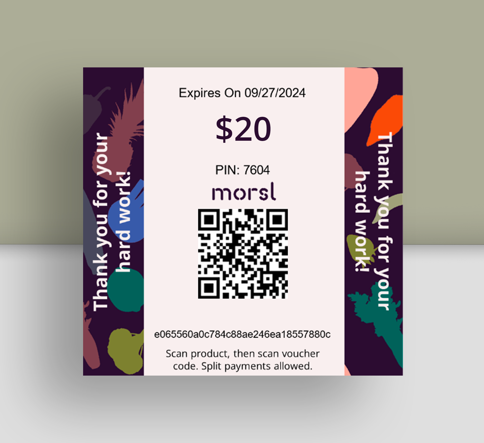A $20 gift card for your Morsl micro market. A fantastic way to engage your team, express appreciation for their hard work and recognise outstanding performance.